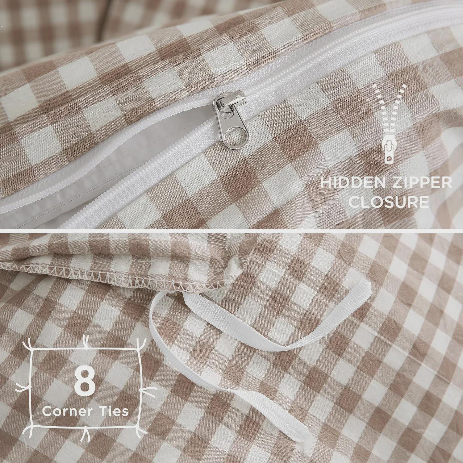 Convenient Features: Hidden Zipper Closure & 8 Corner Ties. Hidden zipper closure for a seamless look. 8 corner ties securely hold your duvet in place, preventing slips or bunching.